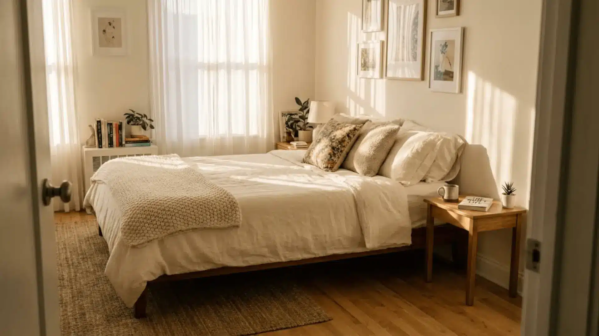 Stick to light colors like ivory, soft white, or pale sage on walls and bedding to reflect light and make the room feel more open.