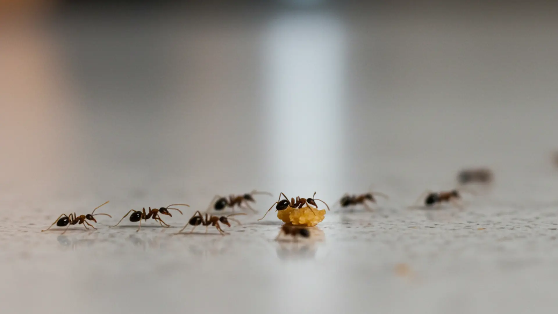 Line of ants walking across a kitchen countertop toward a small food crumb near the backsplash.