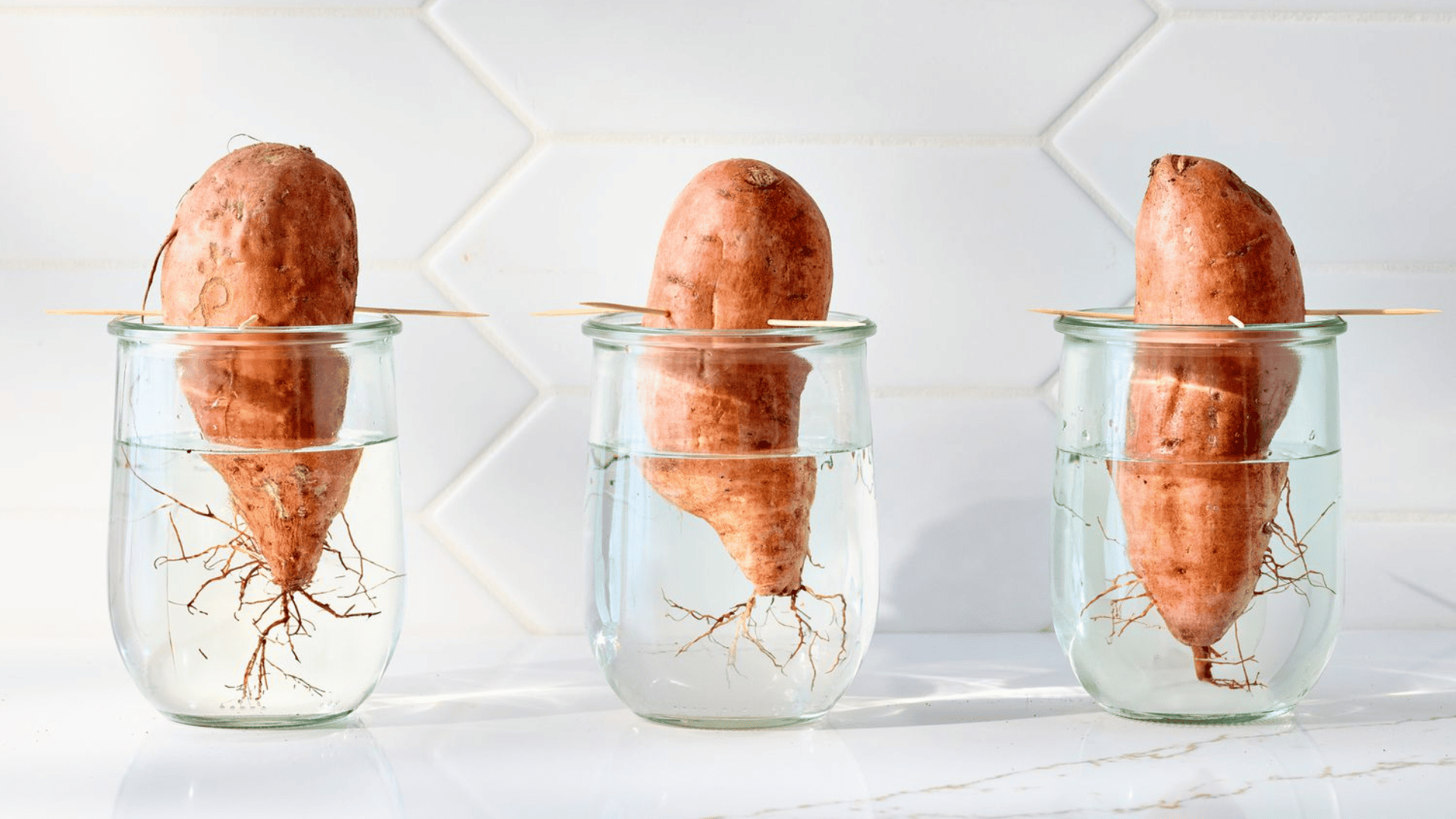 Grab a firm sweet potato and stick 3–4 toothpicks around the middle. This helps suspend it over a jar with about two-thirds of it sitting in water.