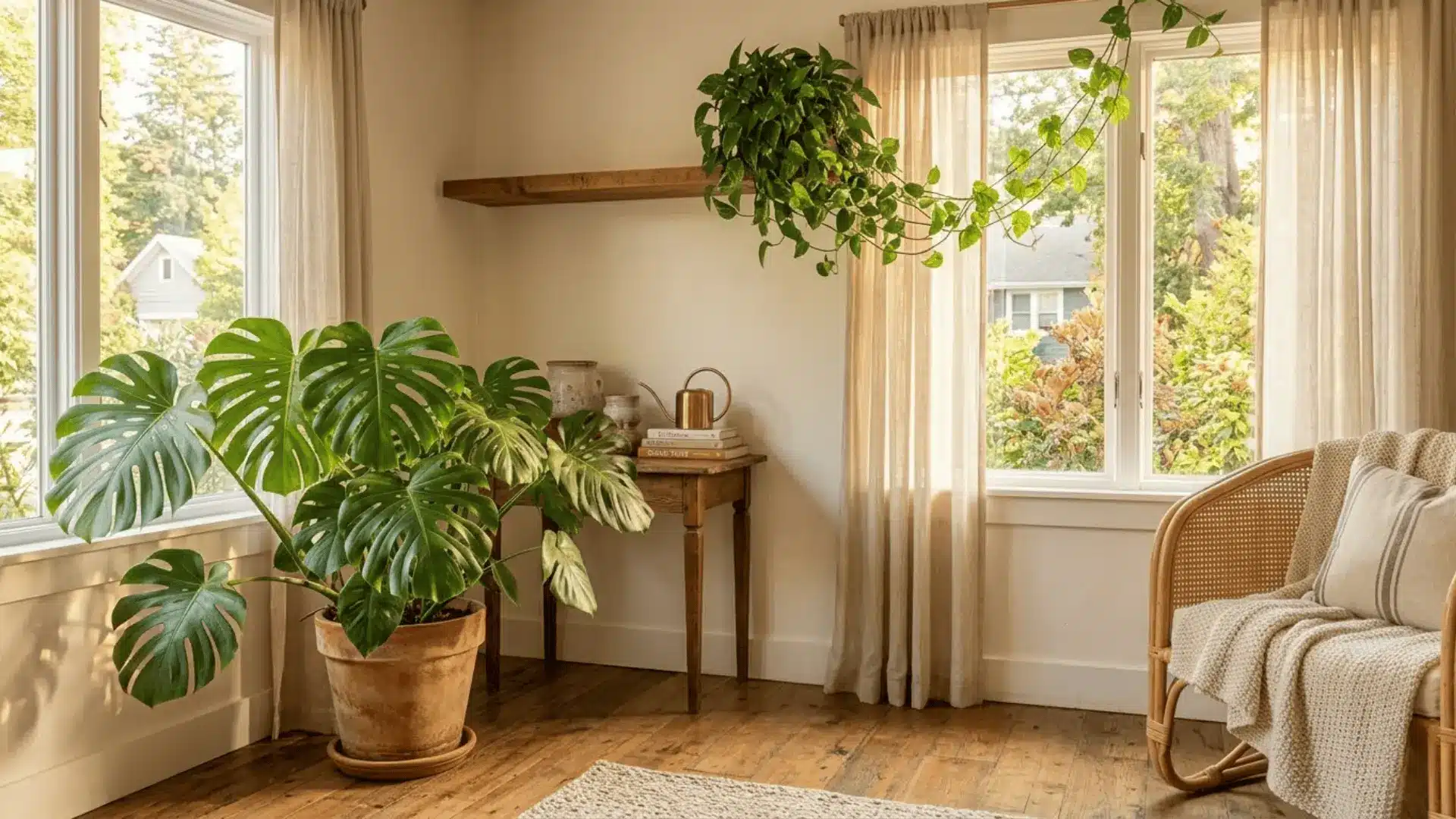 A trailing pothos on a shelf or a lush monstera by the window just makes a room feel alive.